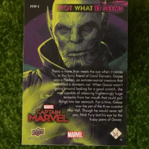 A fantastic insert card that captures a key reveal! This is the 2020 Upper Deck Captain Marvel Goose Not What It Seems NW-1. This insert set is perfectly named to celebrate the surprising truth about Goose the Flerken. The card’s design and title perfectly encapsulate the twist that delighted audiences in the “Captain Marvel” movie. For collectors of insert sets or fans of Goose, this is a must-have card. It’s a fun and creative tribute to a character who proved to be much more than just a cute cat. A great addition to any Marvel card collection.