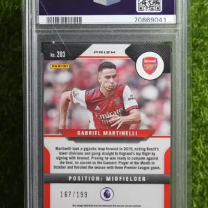 A vibrant and collectible card of an Arsenal fan-favorite. This is the 2021-22 Panini Prizm Gabriel Martinelli Red Prizm, numbered to 199. Gabriel Martinelli is one of the most exciting and energetic players in the Premier League, and his cards are highly sought-after. This Red Prizm parallel from the flagship Panini Prizm set is a fantastic way to add a numbered card of the Brazilian forward to your collection. The bold red color is a great match for the Arsenal kit, making this a visually appealing card for any Gunners fan.