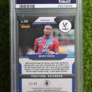Discover a rare rookie card of a promising defender with the 2021-22 Panini Prizm Marc Guéhi Purple Ice Prizm, serial numbered to a limited 49 copies. Marc Guéhi has impressed since his move to Crystal Palace and has broken into the England national team setup, making his rookie cards a hot commodity. The ‘Purple Ice’ parallel is a visually appealing design from the flagship Panini Prizm set, offering a cool and colorful alternative to the base card. Its scarcity and the player’s potential make this a savvy investment for those looking to collect the stars of the future.