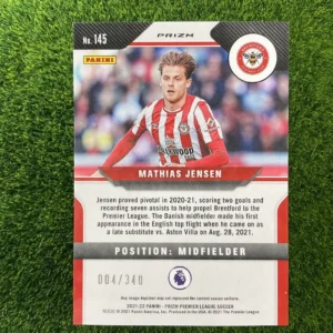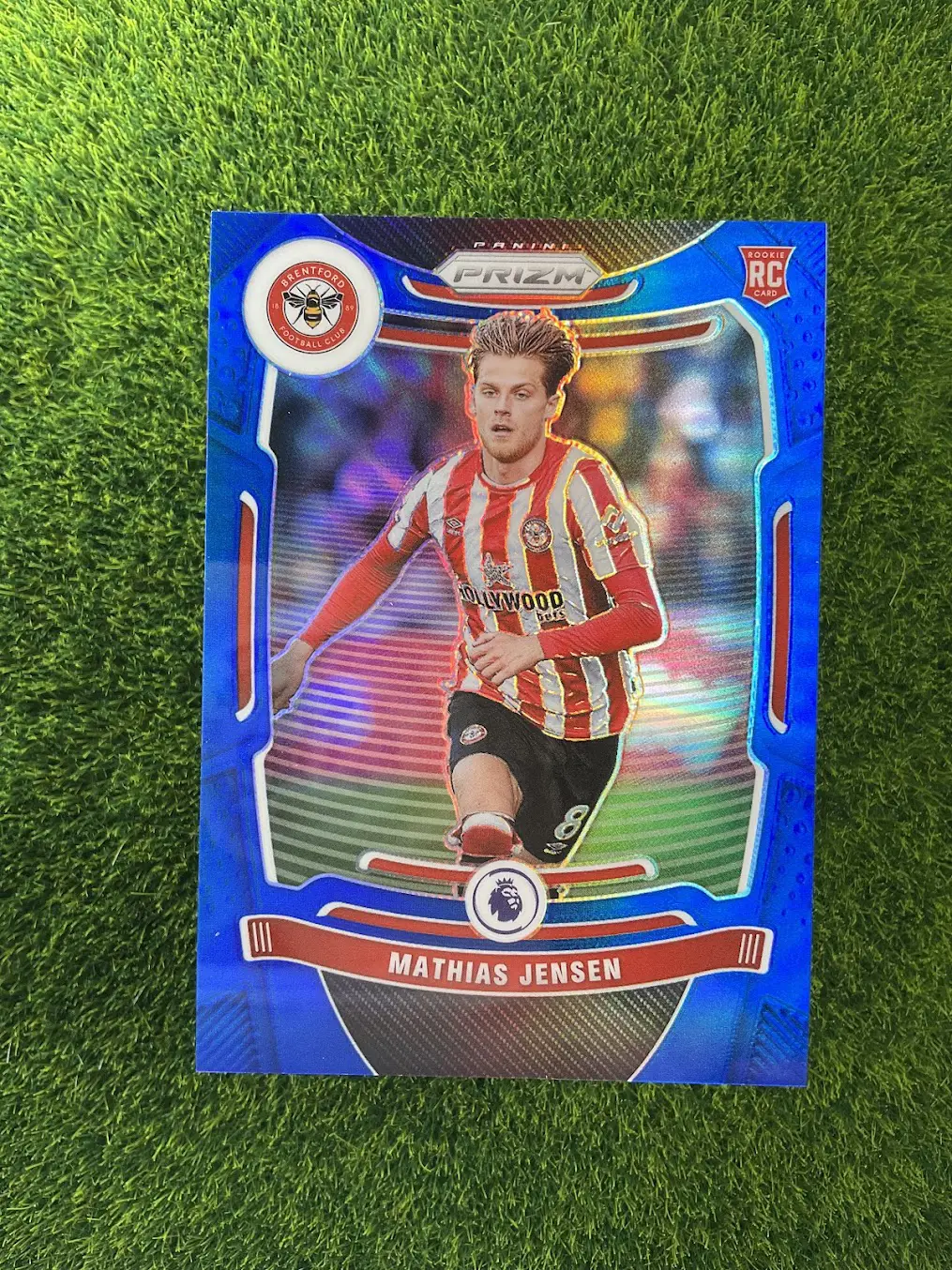 A fantastic rookie card of the Danish international midfielder, Mathias Jensen. This is the 2021-22 Panini Prizm Blue Prizm rookie card (RC). This card captures the debut Premier League season of the Brentford star and is a numbered limited edition, 4 out of 340. It’s a great investment piece for any Bees supporter or collector of rookie cards.