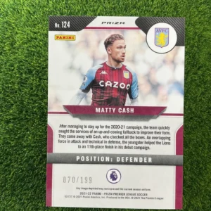 A vibrant parallel card of the Aston Villa and Poland international, Matty Cash. This is the 2021-22 Panini Prizm Red Prizm. The iconic Prizm brand is a must-have for any modern collector, and the Red Prizm is a classic, colorful parallel. This card is a numbered limited edition, 70 out of 199. It’s a fantastic card for any Villa supporter or fan of the Polish national team.
