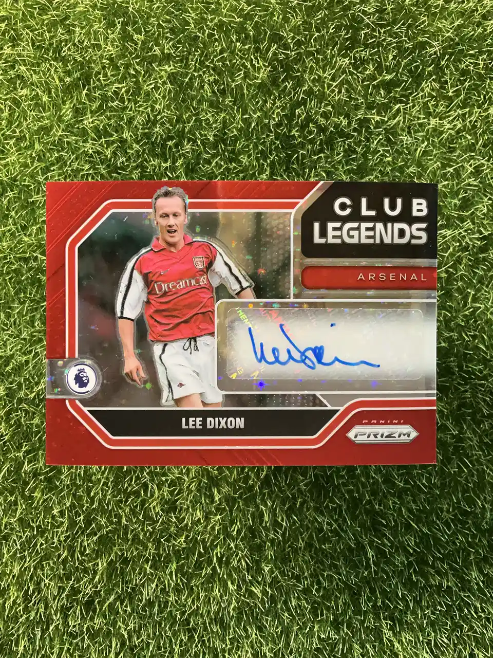 A vibrant autographed card of an Arsenal legend. This is the 2021-22 Panini Prizm Premier League “Club Legends” Red Prizm auto of Lee Dixon. This card features a certified signature from the iconic right-back on the eye-catching Red Prizm parallel. A must-have for any fan of the famous Arsenal back four.