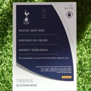 Tags: 2021, Autograph, Giovani Lo Celso, Heung-Min Son, Immaculate Collection, Japhet Tanganga, Panini, Serial Numbered, Tottenham Hotspur, Triple Autograph