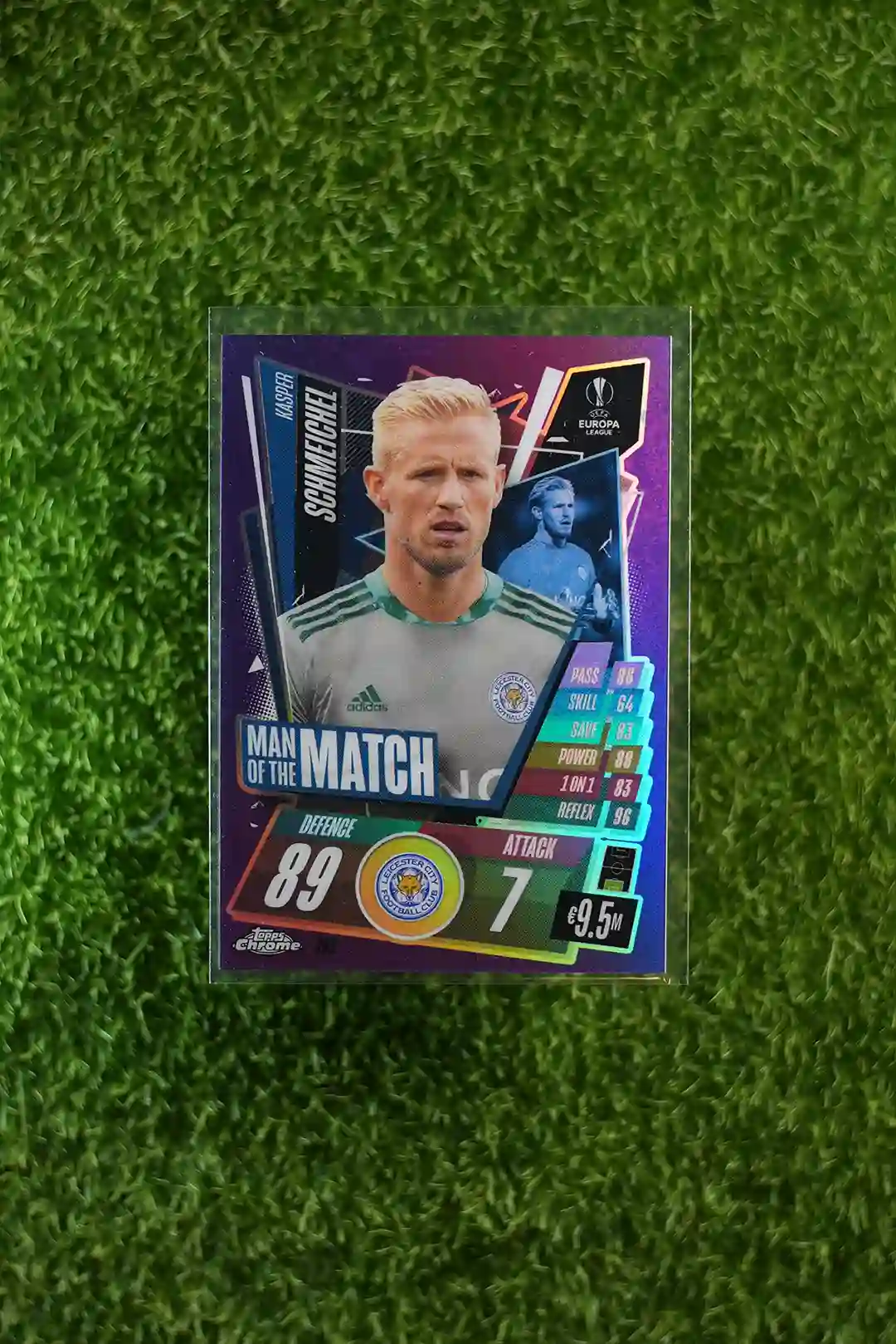 & Free Shipping2021 Topps Match Attax Chrome Kasper Schmeichel Man of the Match card, serially numbered to 299 copies.