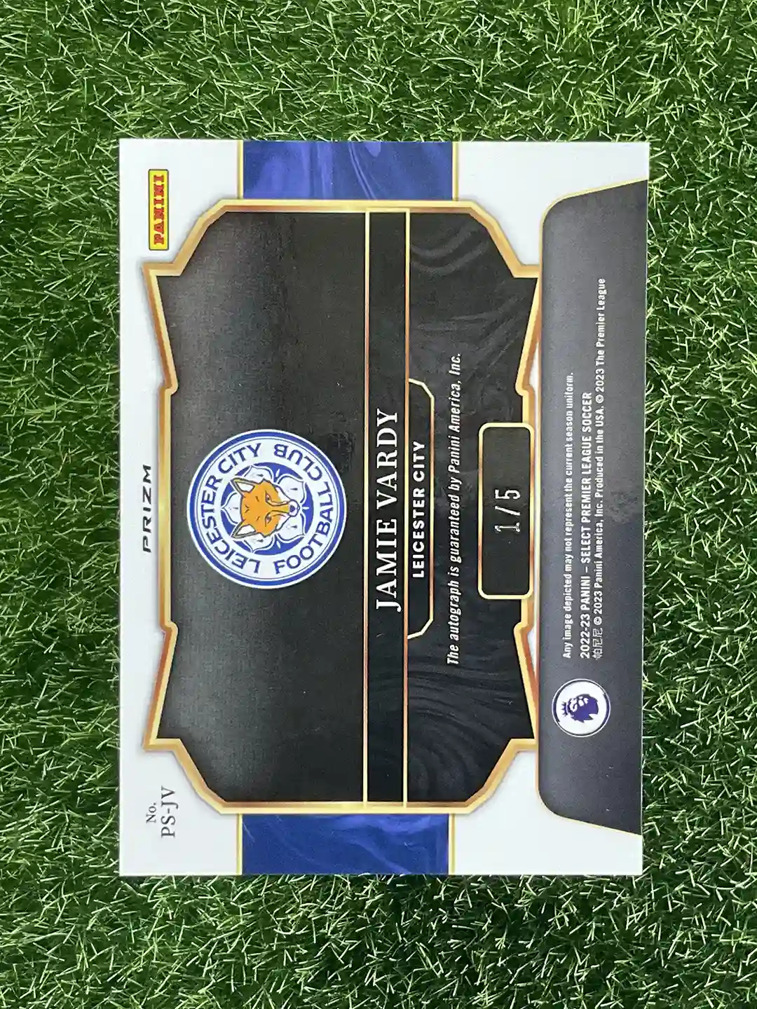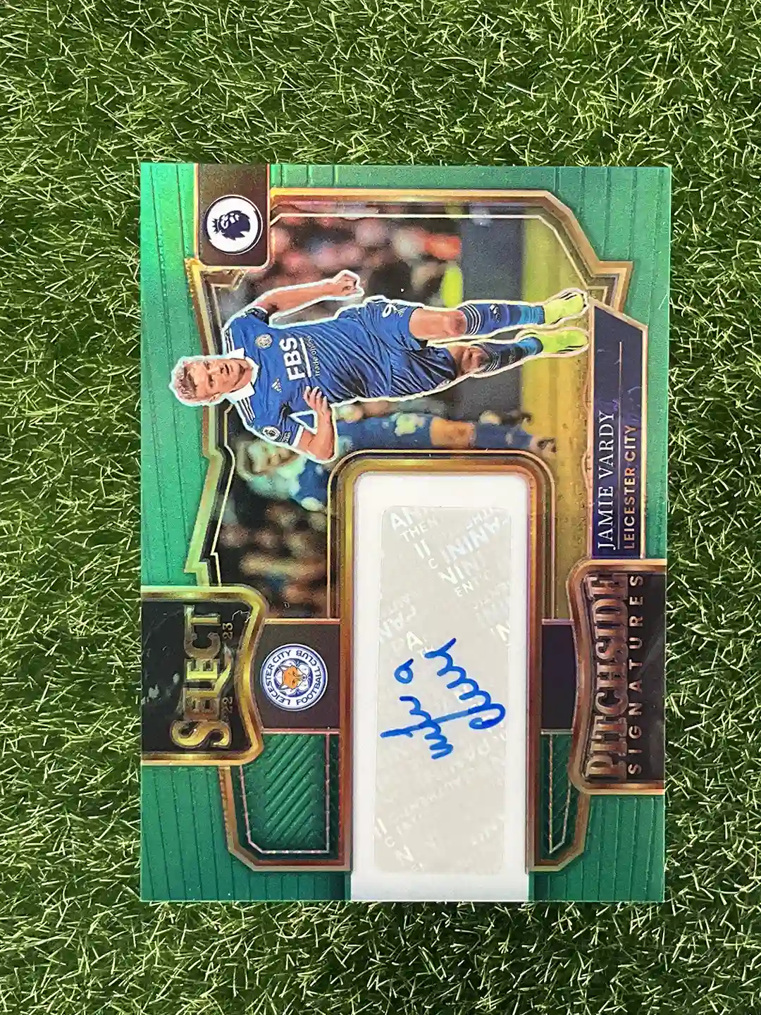 2022-23 Panini Leicester City Jamie Vardy Select Premier League Soccer PS-JV Auto, Field Side Signatures, Green Prizm 1/5