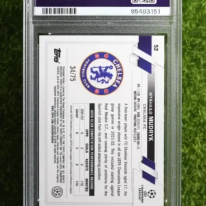 Get in on the ground floor with a key rookie card of a lightning-fast winger. This is the 2022-23 Topps UEFA Club Competitions Mykhailo Mudryk Purple Foil, serial numbered to a limited 75 copies. This card is from the flagship Topps Champions League set and features Mykhailo Mudryk during his breakout period. The Purple Foil parallel is a sharp-looking and relatively scarce version of his first major European release. For collectors looking to invest in the next generation of football talent, this numbered rookie card of the Chelsea star is a fantastic and affordable option with significant upside potential.