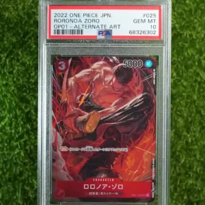 & Free ShippingA pristine 2022 One Piece Japanese (JPN) Roronoa Zoro Alternate Art (AA) Super Rare (SR) card, OP01-025. This highly collectible card has been professionally graded PSA 10 Gem Mint.