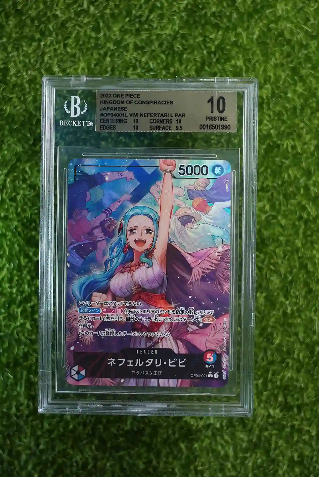 & Free ShippingThis is the 2023 One Piece Card Game Kingdom of Conspiracies Nefertari Vivi Leader Parallel card. Identified as OP04-001, this special variant showcases the iconic character as a unique parallel leader.