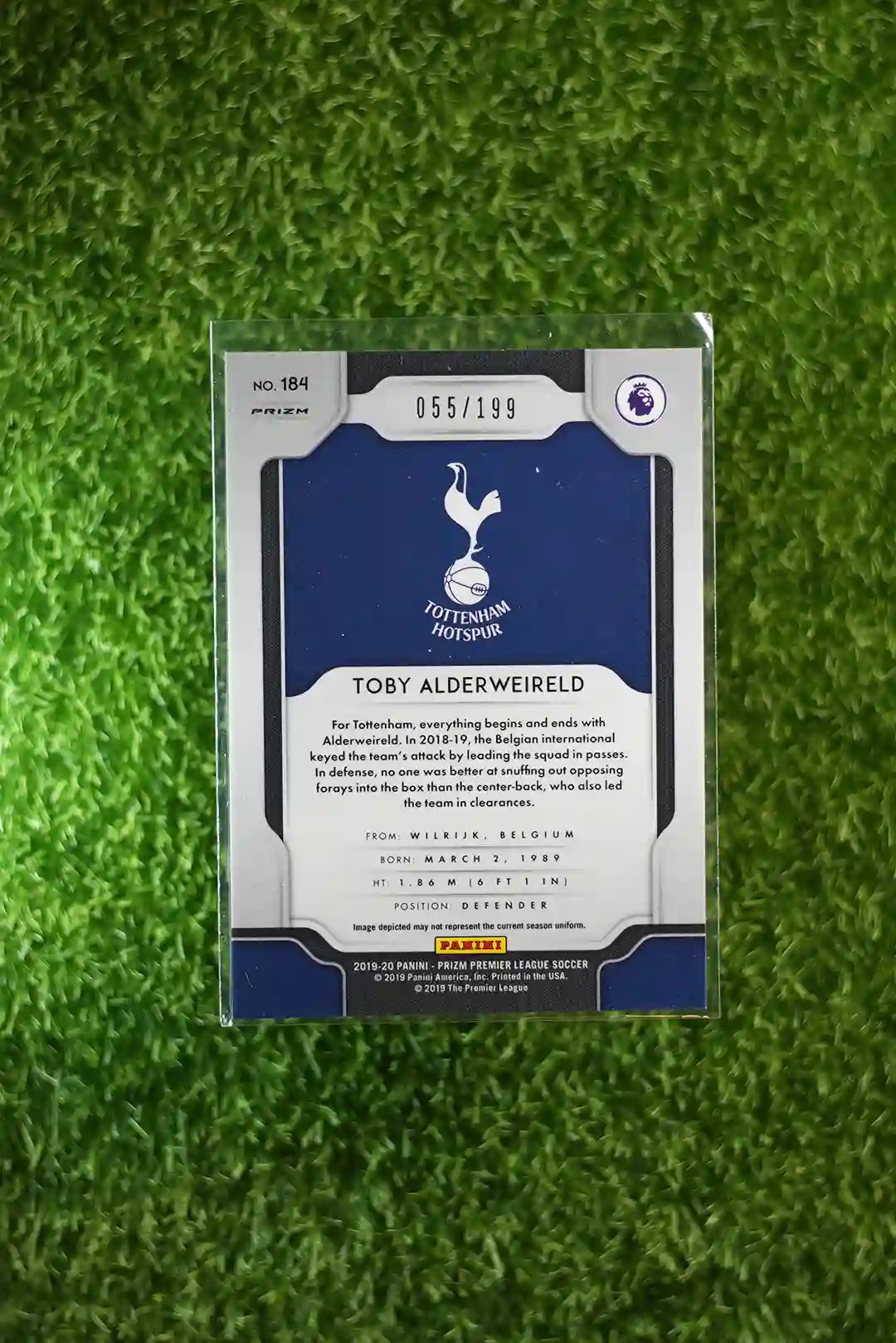 & Free Shipping2019-20 Panini Prizm Premier League Soccer Blue Prizm Toby Alderweireld trading card, limited to 199 copies.